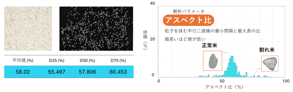 正常米と割れ米の比率は食味に影響を与えるため、個数・サイズ・形状を確認することが重要です。