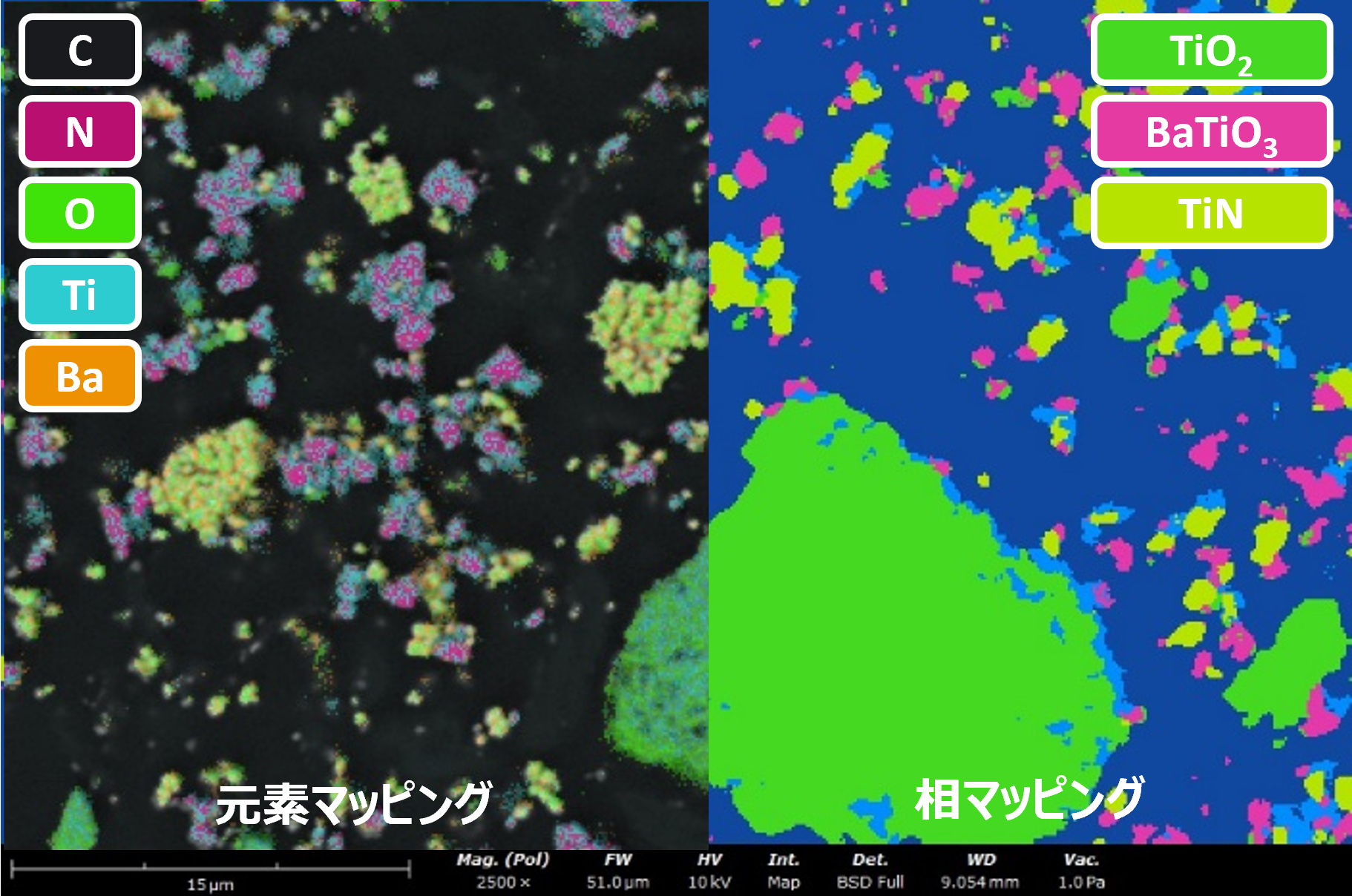 - SEM像や元素マッピングでは判断できない成分(化合物)を識別