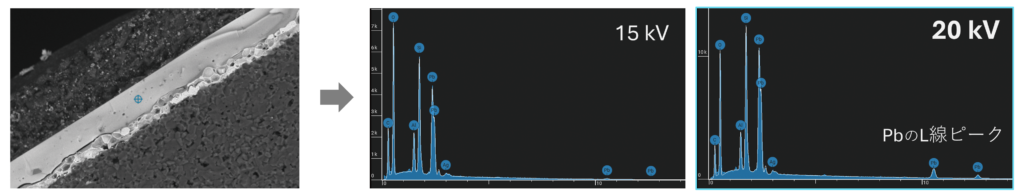 15 kVに加え、より高加速電圧が必要な分析にも対応します。スペクトルは、鉛(Pb)を15 kVと20 kVで分析した例です。