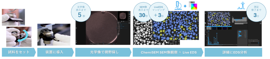 試料導入から僅か30秒でSEM像を表示、そのままバリアフリーで分析へ。