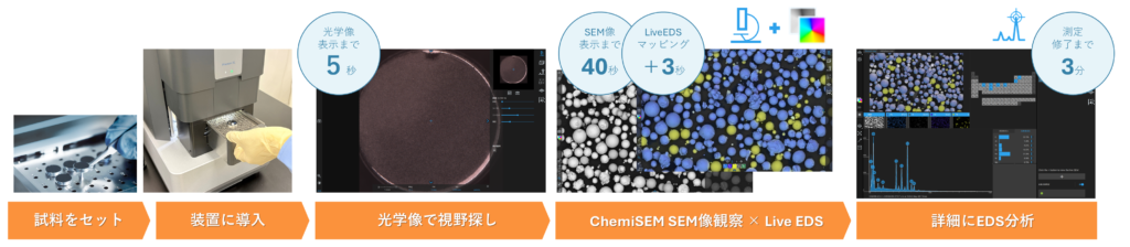 試料導入から僅か30秒でSEM像を表示、そのままバリアフリーで分析へ。