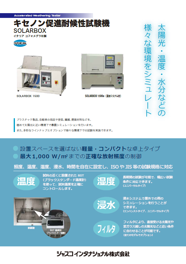 「照度」「波長」「BST温度」「湿度」「浸水」「時間」の各試験条件の自由なプログラムにより、ISOやJISなど幅広い試験規格に対応可能です。